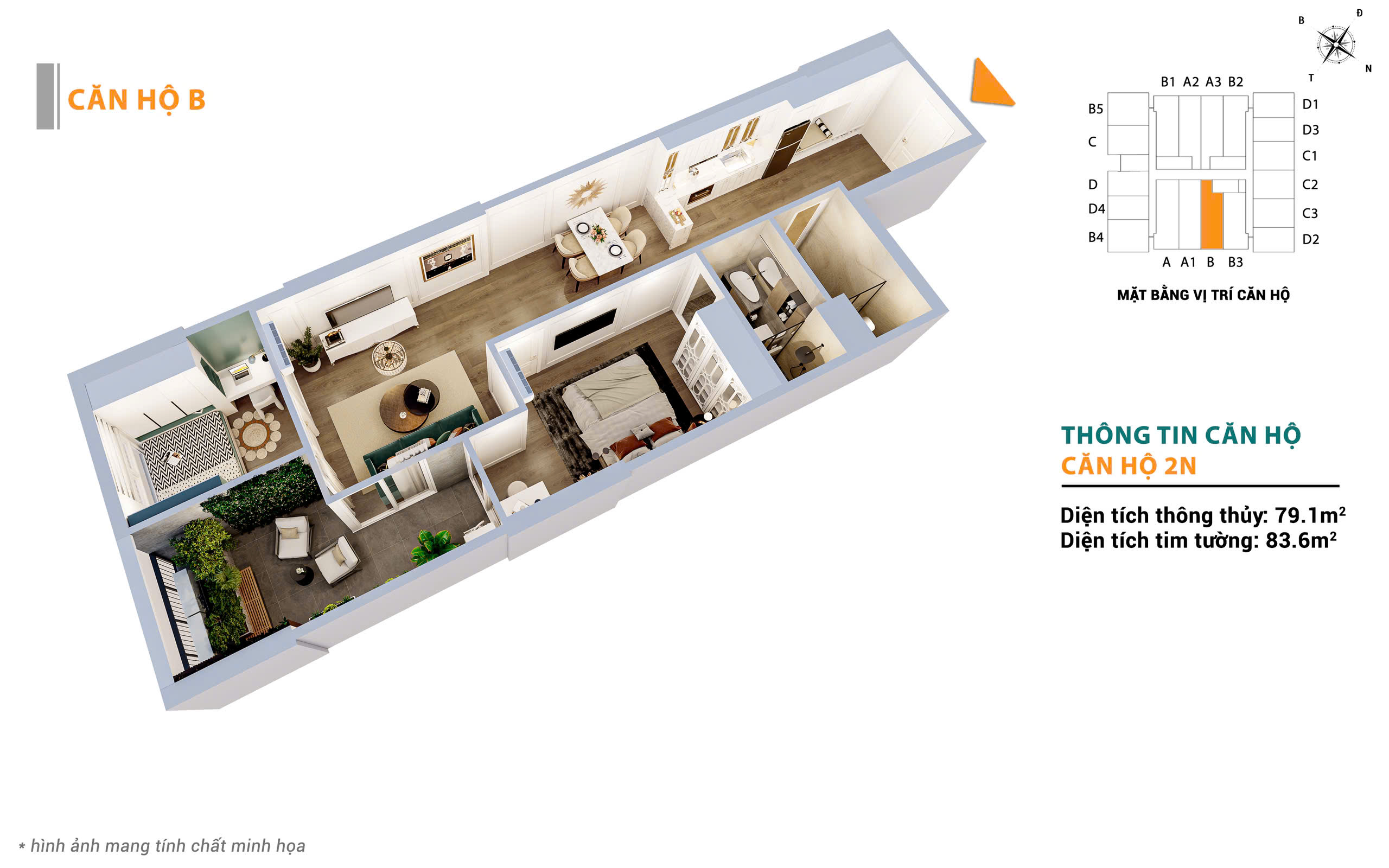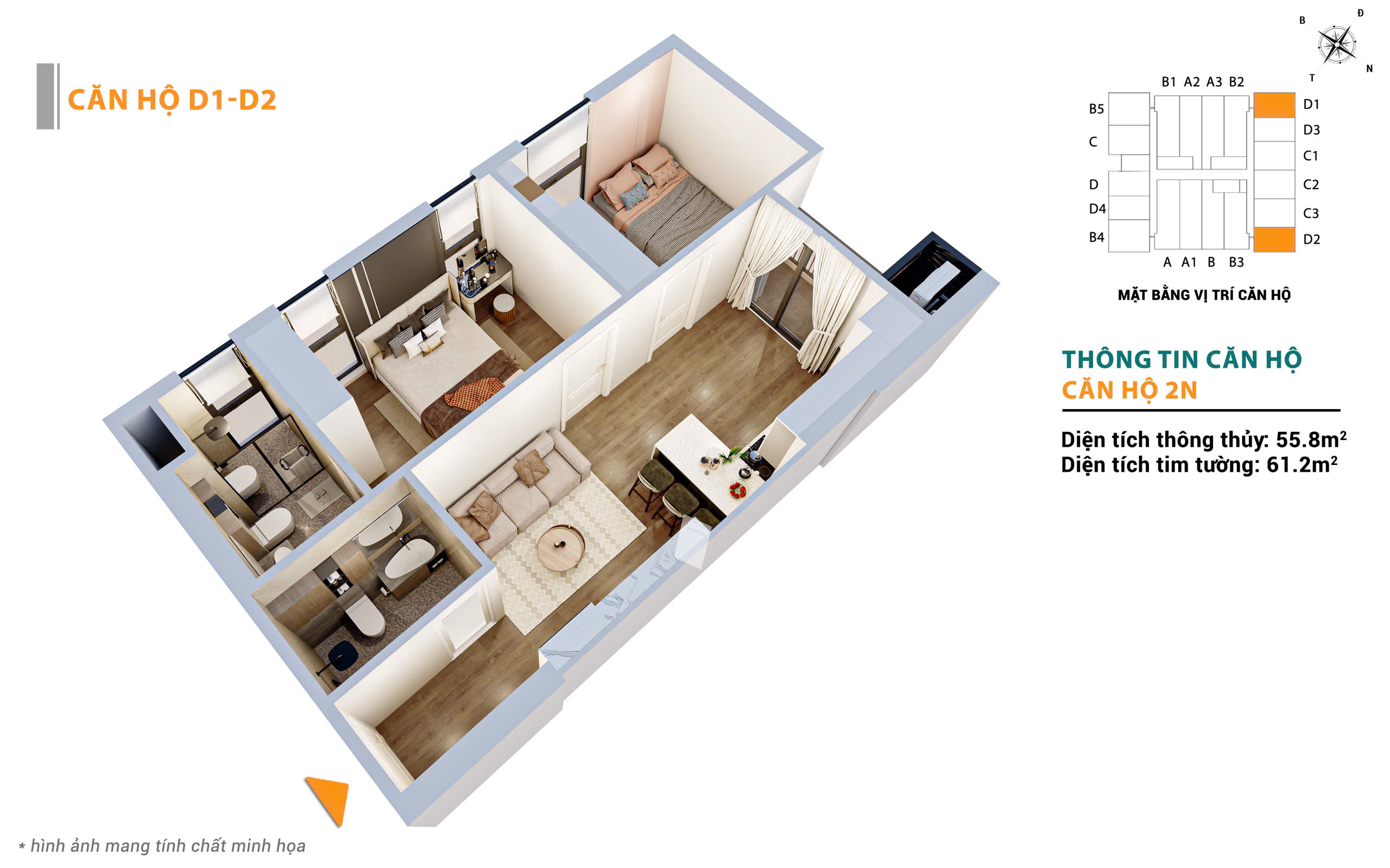 * GIỎ HÀNG ĐẸP NHẤT ĐỢT 1 – GIÁ RẤT MỀM* Số lượng siêu giới hạn – ưu tiên khách xuống tiền sớm* Căn 2 ngủ – 55.8m² (TB – DN):- 2.4 – 2.5 tỷ ~ 43 – 43.5tr/m²- Phù hợp gia đình trẻ – tài chính vừa tầm.
