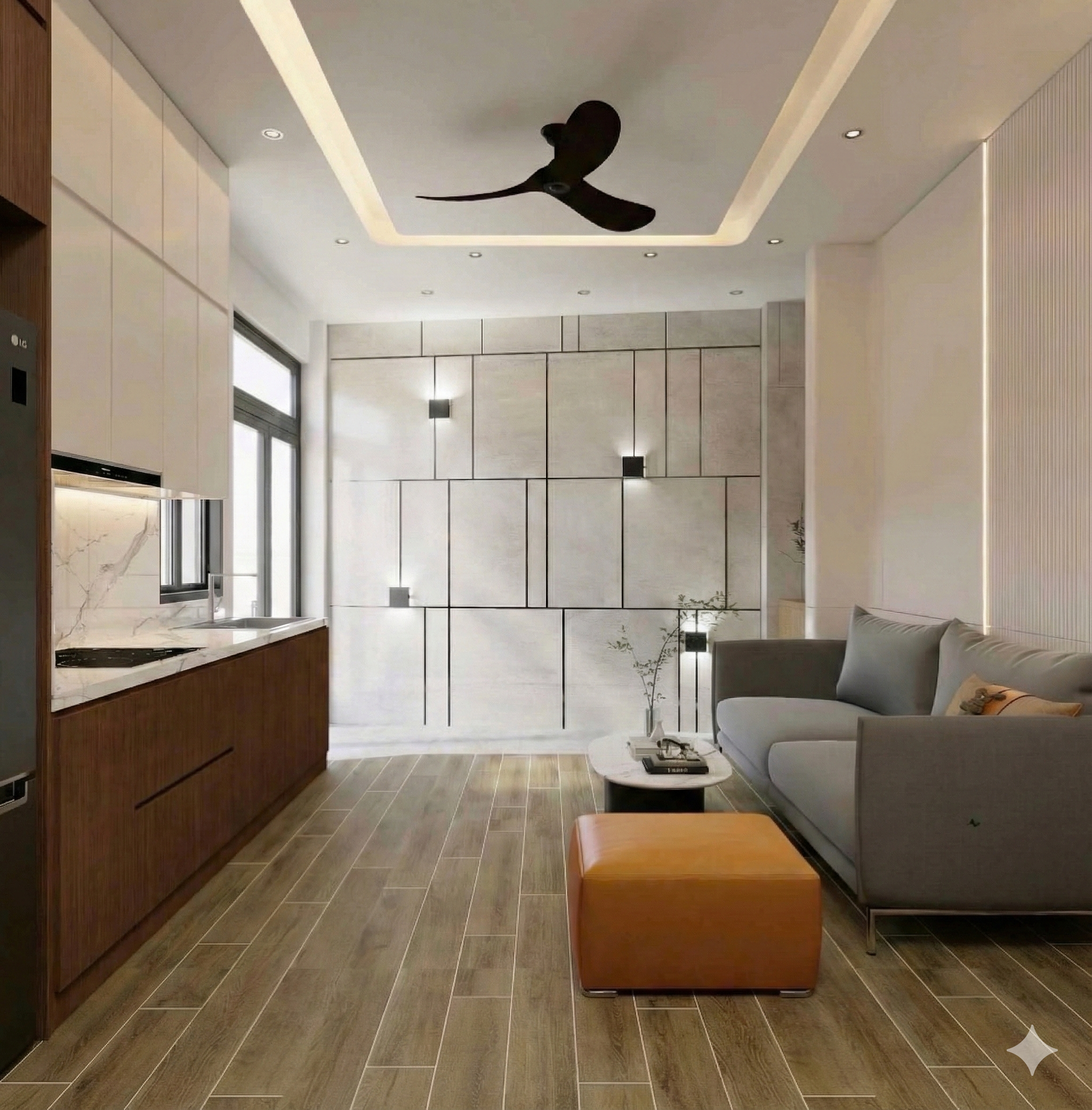 ????Tầng 1 phòng khách, bếp, phòng ăn.